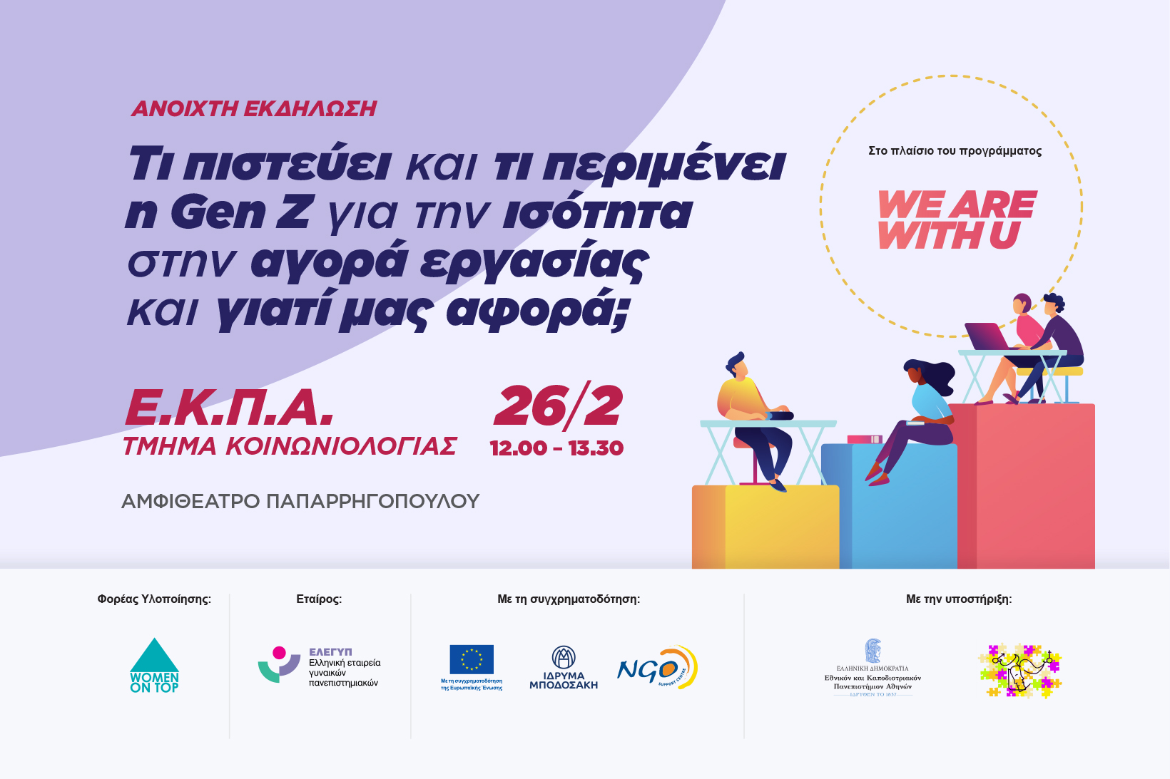 | Τί πιστεύει και τι περιμένει η Gen Z για την ισότητα στην αγορά εργασίας και γιατί μας αφορά; Αγαπητοί φοιτητές, αγαπητές φοιτήτριες επισυνάπτω την πρόσκληση-ανακοίνωση της εκδήλωσης που θα πραγματοποιηθεί με την υποστήριξη και του Τμήματος της Κοινωνιολογίας του ΕΚΠΑ και της Επιτροπής Ισότητας των Φύλων και Καταπολέμησης των Διακρίσεων (ΕΙΦΚΔ) του ΕΚΠΑ, την Τετάρτη 26/2 (12.00-13.30) στο αμφιθέατρο Παπαρρηγοπουλου, Σόλωνος 57 (Μέγαρο Θεωρητικών Επιστημών Μ.Θ.Ε.-Παλαιό Κτήριο). θα χαρούμε πολύ να έρθετε, να συμμετέχετε και να συζητήσουμε.