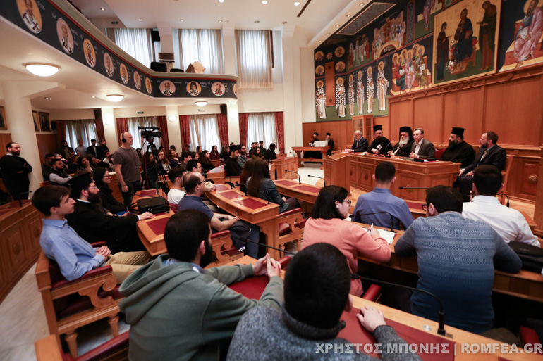 Ακολούθησαν σύντομες εισηγήσεις για το έργο των Συνοδικών Επιτροπών και εν γένει για το πολλαπλό έργο διακονίας στην Εκκλησία της Ελλάδος, το οποίο παρουσίασαν με σύντομες εισηγήσεις τους ο Αρχιγραμματέας της Ιεράς Συνόδου Θεοφιλέστατος Επίσκοπος Ωρεών κ. Φιλόθεος, Αρχιγραμματέας της Ιεράς Συνόδου, ο π. Ιγνάτιος Σωτηριάδης, Γραμματέας της Συνοδικής Επιτροπής επί των Διορθοδόξων και Διαχριστιανικών Σχέσεων, ο π. Παντελεήμων Παπασυννεφάκης, Γενικός Διευθυντής της ΑΜΚΕ «ΣΥΝΥΠΑΡΞΙΣ» της Εκκλησίας της Ελλάδος, ο π. Εμμανουήλ Παπαμικρούλης, Γραμματέας της Υποεπιτροπής Υποτροφιών, και ο Γενικός Διευθυντής της Επικοινωνιακής και Μορφωτικής Υπηρεσίας της Εκκλησίας της Ελλάδος και Διευθυντής του Ραδιοφωνικού Σταθμού 89,5 κ. Αλέξανδρος Κατσιάρας. Δημιουργός: Λουκάς Ζιάρρας |