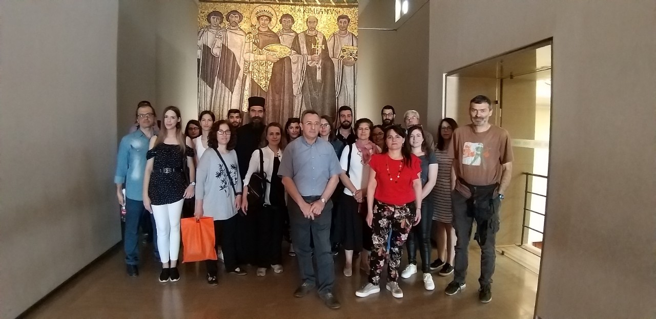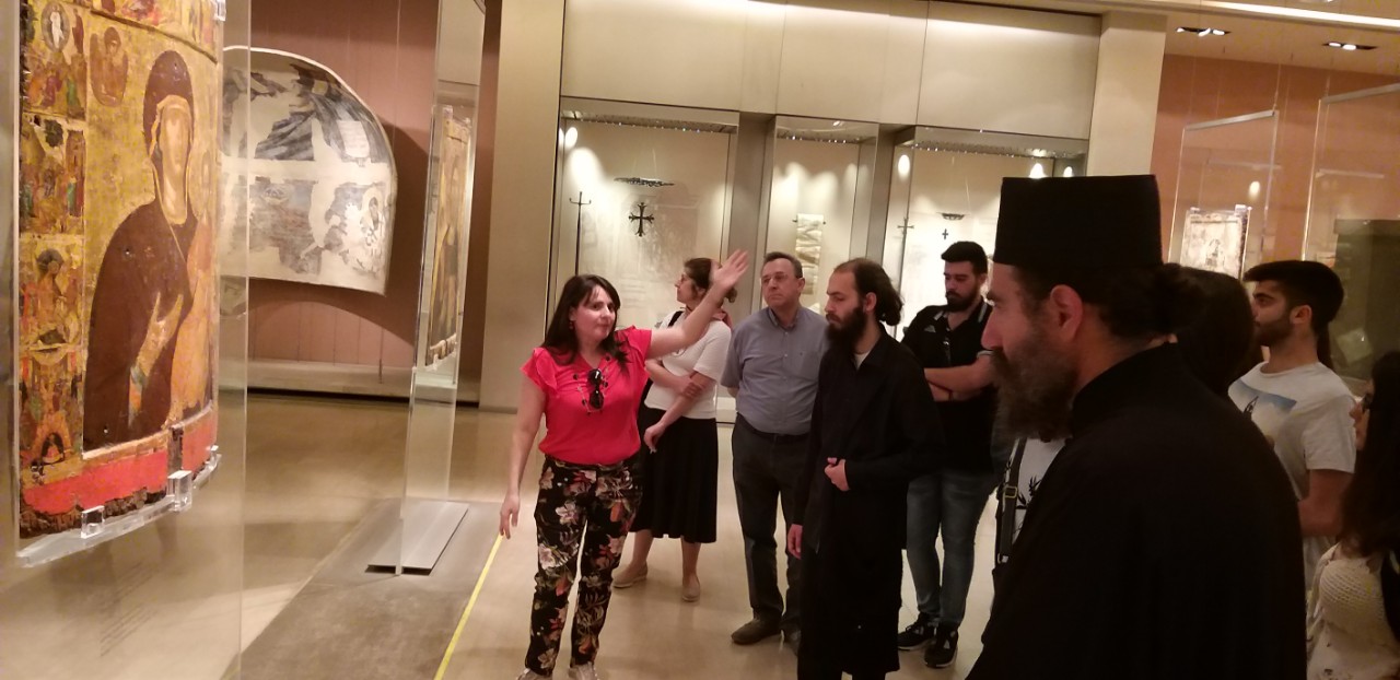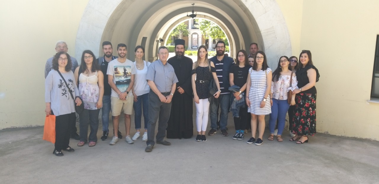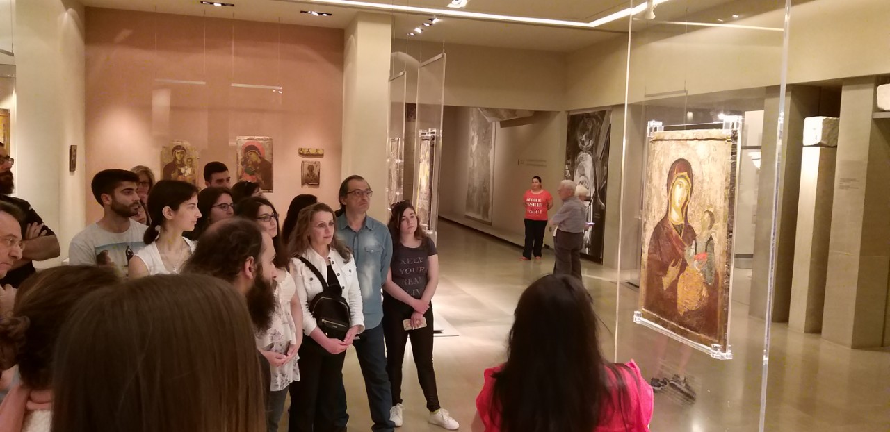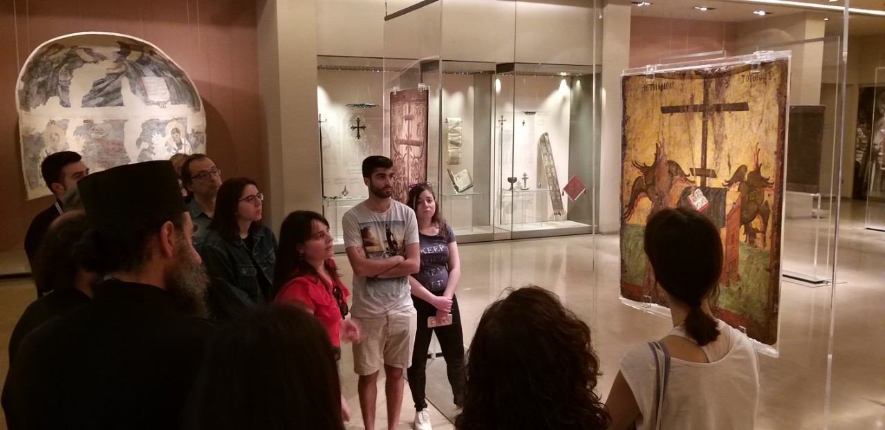 | Εκπαιδευτική επίσκεψη στο Βυζαντινό και Χριστιανικό Μουσείου Αθηνών, 31 Μαΐου 2019 Από την πρόσφατη εκπαιδευτική επίσκεψη (31 Μαΐου 2019) ομάδας φοιτητών και φοιτητριών του μαθήματος Δογματική Β του Τμήματος Θεολογίας ΕΚΠΑ στο Βυζαντινό και Χριστιανικό Μουσείο Αθηνών. Την επιστημονική ξενάγηση στα μοναδικά και πλούσια εκθέματά του πραγματοποίησε η βυζαντινολόγος-αρχαιολόγος του Μουσείου κ. Μαρία Σκλείδα, η οποία εστίασε την εξαιρετικά ενδιαφέρουσα παρουσίασή της στις εικόνες του Χριστού και της Παναγίας που παρουσιάζουν ιδιαίτερο δογματικό ενδιαφέρον. Ευχαριστούμε την κ. Μαρία Σκλείδα για την αρχαιολογική, θεολογική και καλλιτεχνική αυτή ξενάγηση, τον προϊστάμενο του τμήματος Εκθέσεων, Επικοινωνίας και Εκπαίδευσης του Μουσείου κ. Περίανδρο Επιτροπάκη, βυζαντινολόγο-αρχαιολόγο, την κ. Ράνια Φατώλα υπεύθυνη Εκπαιδευτικών Προγραμμάτων του Μουσείου, καθώς και τον κ. Βαγγέλη Αρμπιλιά, συντηρητή του Μουσείου για την άδεια και οργάνωση της επίσκεψης, για τη φιλοξενία, τη συνεργασία και τη φιλική διάθεση, για τα αναμνηστικά δώρα και τέλος για το κέρασμα στο cafe του Βυζαντινού και Χριστιανικού Μουσείου!